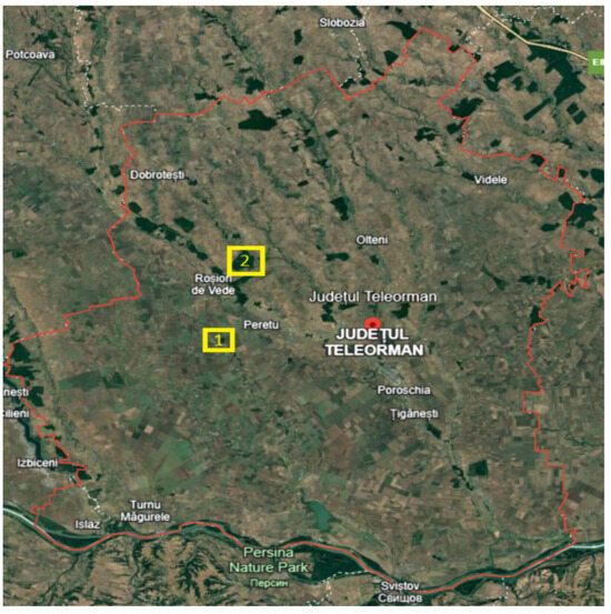 Located in the southern part of the country, Teleorman County occupies a part of the area of the Romanian Plain approximately between Olt and Vedere (Figure 2) [22]. It is intersected by the parallel of 43°37 north latitude (Zimnicea also being the southernmost peak of Romania) and by the meridian of 25° east longitude (Traian, Troianul, Roșiorii de Vede, Drăcșănei, Siliștea Nouă). Neighboring counties: Giurgiu, Dâmbovița, Argeș, and Olt. The southern boundary, formed by the Danube, corresponds to the state border with Bulgaria. From the point of view of altitude, the territory of Teleorman County stretches between 20 m in the Danube meadow and about 160–170 m in the northern part, on the border with Argeș County.