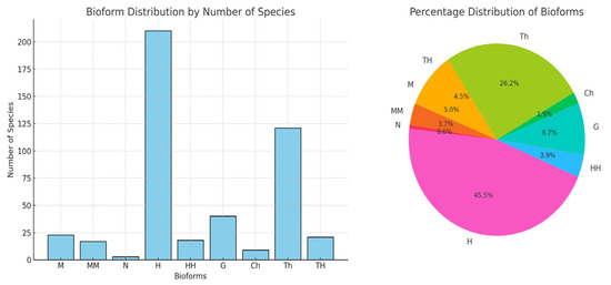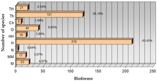 By studying the spectrum of bioforms in an area, conclusions can be drawn regarding the geomorphology of the territory, the anthropogenic impact produced on the territory, and the category of land use. This is because phanerophytes (MM, M, N) grow in forests; camephytes (Ch) adapted to extreme living conditions prefer both mountaintops, rocks, or polar areas and desert areas; hemicryptophytes (H) grow in meadows and forests; geophytes (G) prefer forests; helohydatophytes (HH) grow only in swamps; and therophytes (Th) grow in deserts, steppes, in areas with dry and calm climates, on agricultural land, and in weeds. Analyzing the bioforms (Figure 3), it is observed that there is a high percentage of hemicryptophytes (H) of 45.45%. Dominant bioform—hemicryptophytes (H): number of species: 210 (45.45%). Hemicryptophytes represent almost half of the total species registered in the county. These plants have their renewal buds at ground level and are characteristic of temperate zones. Their dominance suggests that the flora of the county is well adapted to temperate climatic conditions, with hot summers and cold winters. Percentage of therophyte (Th) species, number of species: 121 out of 26.19%. Therophytes are annual plants that survive adverse periods in the form of seeds. A high percentage of therophytes indicates a climate with a short growing season or a high presence of cultivated or man-damaged land. The other types of plant species are present in a smaller percentage: geophytes (G)—8.65%, camephytes (Ch)—1.94%, phanerophytes (MM)—3.67%, (M)—4.97%, (N)—0.64%, and helohydatophytes are present in a percentage of 3.89%. The percentage scheme for the number of species of bioforms is represented in Table 1, made following the determinations. Achieving the bioform spectrum involves creating a visual representation of species diversity in a given area or habitat. The spectrum of bioform can highlight different aspects of the species community, such as distribution based on characteristics such as grouping. The spectrum of bioform is represented in Figure 4, being a valuable tool in the study and conservation of biodiversity in Teleorman County. By illustrating the diversity of species, it provides a comprehensive picture of ecological relationships and helps to make decisions in the process of managing natural resources.