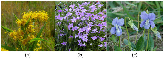Figure 6. (a) Solidago giant Aiton; (b) Campanula patula L.; (c) Viola canina L.