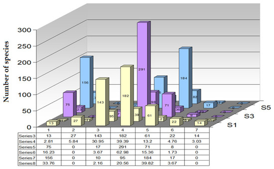 Following the analyses carried out in Teleorman County on the flora, it was found that after long adaptations to environmental conditions, the current plant species have optimal growth and development between certain limits of moisture, temperature, and soil reaction. Each species has certain climatic indices for these three factors (U, T, R), marked from 1 to 6 for humidity and from 1 to 5 for temperature and soil reaction, adding the value 0 (zero). The fact that most of the flower species in Teleorman County are mesophilic species (U3–U3,5), present in a percentage of 39.39%. The mesoxerophilic species (U2–U2,5) have a fairly high share, present in a percentage of 30.95%. From the point of view of the affinity of the species existing in the flora of Teleorman County to the temperature factor, most of the species are micromesotherms (T3–T3,5), present in a percentage of 62.98%. Also, the presence of eurythermal species (T0) is noteworthy, present in a percentage of 16.23%. Following the affinities of plant species for soil reaction, it is observed that most species are low-acid neutrophils (R4–R4,5), present in a percentage of 39.82%, which means that they prefer soil with neutral to slightly acidic pH, followed by eurionic species (R0), present in a percentage of 33.76%, data presented in the graph in Figure 10.