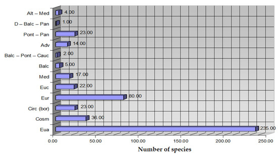 For the analysis of the floristic elements, we conclude the predominance of Eurasian (Eua), European (Eur), Balkan (Balc), Mediterranean (Med), Cosmopolitan (Cosm), Circumpolar (Circus), and Central European (Euc) species, but also the presence of a large Pontic species (Pontus). The spectrum of geoelements is shown in Figure 11. Knowledge of the floristic elements is necessary, firstly, to characterize the flora of the researched region from a chorological (areological) point of view and, secondly, to make the biogeographical region of the examined area.