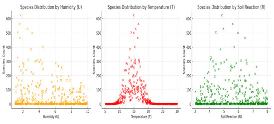 We also calculated the fractal size for each parameter using the log-log regression method: fractal size for moisture (U)—0.489; fractal size for temperature (T)—0.758; and fractal size for soil reaction (R)—0.089. The fractal size b gives us information about the complexity and variability of species distribution in relation to each climatic factor: temperature (T) of 0.758—the distribution of species as a function of temperature is more variable and presents a more complex pattern. Species seem to be more influenced by temperature variations than by the other factors: humidity (U) of 0.489—humidity plays a role in the organization of flora, but its influence is less than that of temperature; soil reaction (R) of 0.089—almost linear, non-fractal distribution; the impact of pH on species diversity seems to be much lower compared to temperature and humidity. Temperature has the greatest impact on species diversity, having the largest fractal size (0.758). This suggests that the flora of Teleorman County is strongly influenced by temperature variations. Humidity has a moderate impact (0.489), which means that the distribution of species is partially influenced by this factor, but not as strongly as temperature. The soil reaction has a low impact (0.089), indicating that soil pH does not play a major role in floristic diversity; soil pH has a weak effect on species distribution in this region. We made graphs for the distribution of species according to humidity (U), temperature (T), and soil reaction (R).