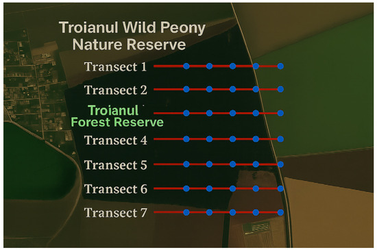 Figure 14. Scheme for the application of transects in the protected area—Troianul Forest Reserve.