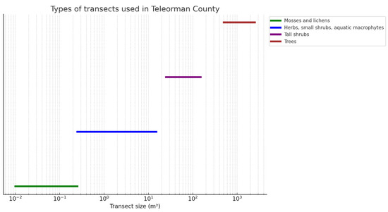 Figure 14 shows the positioning of the transects that were placed along the main lines in one of the studied areas, the Troianul Forest Reserve, proceeding exactly with the other areas that are part of the research. The technique used to determine the plant community for mosses and lichens consisted of changing the dimensions used from transects of 0.01–0.25 m2 to transects of 0.25–15 m2 for grasses, small shrubs, and aquatic macrophytes; 25–150 m2 for tall shrubs; and 500–2500 m2 for trees, as shown in Figure 15. The sketch and analysis of the flora in Teleorman County were made based on field observations made in the summer and autumn of 2022.