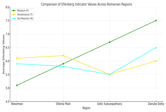 Figure 16. Comparative diagram regarding the Ellenberg values obtained from other regions of Romania: Oltenia Plain, Getic Subcarpathians, Danube Delta, and Teleorman County.