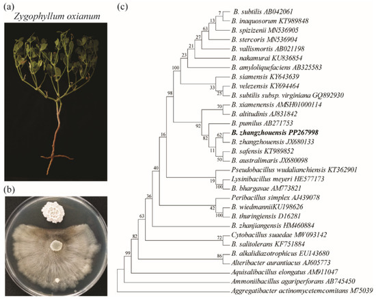 A phylogenetic analysis of the identified antagonistic bacteria. (a) Z. oxianum plant from Aral lake. (b) The co-cultivation of B. zhangzhouensis with C. mali. (c) The phylogenetic relationship of the antagonistic B. zhangzhouensis bacterium. The evolutionary history was inferred using the maximum likelihood (ML) method and the Tamura–Nei model. The percentage of trees in which the associated taxa clustered together is indicated next to the branches. Initial trees for the heuristic search were generated automatically by applying the Neighbor-Joining (NJ) and BioNJ algorithms to a matrix of pairwise distances estimated using the Tamura–Nei model. A. elongatus, A. agariperforans, and Ag. actinomycetemcomitans were used as outgroups.
