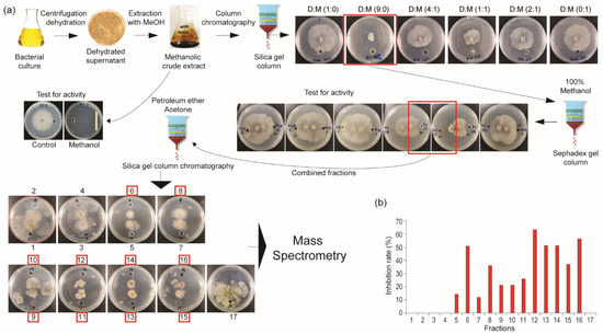Bioactive antifungal compound isolation from bacterial extract through successive chromatographic steps and mass spectrometry. (a) The step-by-step workflow for the isolation of active fractions exhibiting antifungal activity. (b) Inhibition rates of the isolated active fractions.