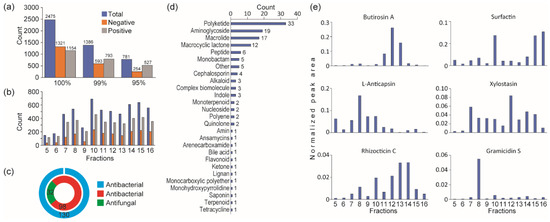 Mass spectrometry analysis of active fractions. (a) Statistics of metabolites identified from various ionization modes and number of metabolites at 100%, 99%, and 95% confidence levels. (b) Distribution of metabolites at 95% confidence across fractions exhibiting antifungal activity. (c) Reference-based functional descriptions of antibiotic metabolites obtained through database annotations. (d) Distribution of proposed antibiotics categorized by class. (e) Levels of potential antifungal compounds specific to Bacillus species across the fractions.