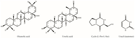 Based on TLC analysis, non-active fractions 3 and 4 each contained a single compound, while the 17th fraction contained two distinct compounds. The 17th fraction was subsequently re-purified using silica gel column chromatography with the same solvent system. HPLC analysis confirmed the purity of the isolated compounds. For structural elucidation, the purified compounds were further analyzed using NMR spectroscopy (Figure 4). NMR data were obtained for oleanolic acid (13 mg) [36], ursolic acid (4 mg) [37], cyclo-(Pro-Ser) (5 mg) [38], and uracil (30 mg) [39], analyzed (Supplementary Data S1), and validated by comparison with reference data.