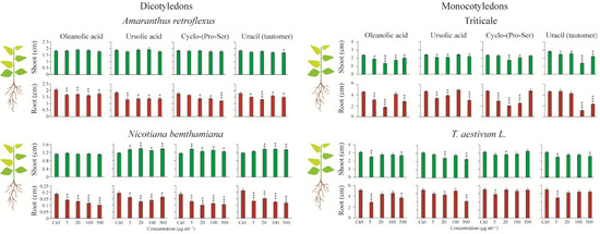 Four concentrations (5, 20, 100, and 500 mg L−1) of each compound were tested on N. benthamiana, A. retroflexus, T. aestivum (wheat), and triticale. The effects were assessed by measuring seedling stem and root lengths. Overall, all tested compounds negatively inhibited root growth in a concentration-dependent manner. This inhibitory effect was more pronounced in dicotyledonous species, where root length was reduced up to 80% at higher concentrations (Figure 5). Monocotyledonous species also exhibited a concentration-dependent response, although sensitivity varied by species. For instance, both oleanolic and ursolic acids significantly inhibited root elongation in triticale and wheat at 5, 20, and 500 mg L−1, but not at 100 mg L−1. Notably, wheat showed no significant reduction in root length at 20 mg L−1 for oleanolic acid and at 5 mg L−1 for ursolic acid. Cyclo-(Pro-Ser) and uracil negatively affected root growth in T. aestivum only at 5 mg L−1, whereas in triticale, cyclo-(Pro-Ser) significantly reduced root length at 5, 20, and 100 mg L−1, and uracil at 100 and 500 mg L−1. In contrast, stem length did not exhibit a consistent dose-dependent trend. In A. retroflexus, stem length remained largely unaffected, except for a slight decrease caused by uracil at 500 mg L−1. Interestingly, ursolic acid, cyclo-(Pro-Ser), and uracil consistently promoted stem elongation in N. benthamiana across all concentrations. Meanwhile, monocotyledonous species (triticale and wheat) generally exhibited reduced stem length, though to varying degrees. Overall, triticale appeared more sensitive than wheat to all tested compounds in terms of both root and stem growth responses.