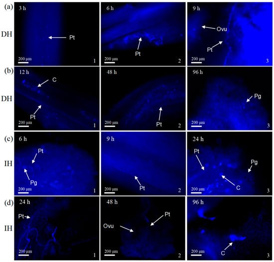 Growth of pollen tubes in the pistil after artificial pollination in two hybrid combinations. (a) Growth of pollen tubes after the style reaches the base in distant hybridization (DH). Three hours post-pollination, some pollen tubes (Pts) can already be seen penetrating the style interior. By 6 h, the pollen tubes had grown to the middle of the style. At 9 h, some pollen tubes were seen to twist and grow into the ovary, uniting with the ovules (Ovus). (b) Growth of pollen tubes after the style reaches the base in distant hybridization. By 12 h, increased pollen germination and callose (C) production were observed on the stigma. At 48 h, pollen tubes (Pts) entered the ovary with spiral growth and intermittent callose accumulations near the ovules. At 96 h, pollen grains (Pgs) were present on the maternal stigma, with some showing signs of shrinkage. (c) Growth of pollen tubes before the style reaches the base in intraspecific hybridization (IH). At 6 h post-pollination, a small number of pollen grains (Pgs) were observed on the stigma’s surface, with some pollen tubes (Pts) just penetrating through the papilla cell layer into the interior of the stigma. By 9 h, pollen tubes had grown to the middle of the style. At 12 h, the number of germinating pollen grains had increased, and a significant amount of callose (C) was produced at the two-thirds point along the style. (d) Growth of pollen tubes after the style reaches the base in intraspecific hybridization. By 24 h post-pollination, pollen tubes (Pts) had reached the base of the style, but exhibited twisting and coiling, along with callose (C) accumulation, which prevented normal entry into the ovary. Contact between pollen tubes and ovules (Ovus) was not observed until 48 h, and it was not until 96 h that callose (C) phenomena at the embryo sac indicated the completion of fertilization.