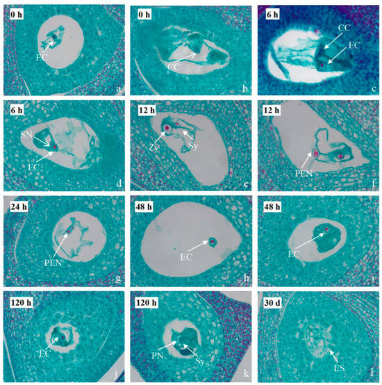 Early embryonic development in distant hybridization (DH) crosses using C. gymnogyna (CGC) as the pollen donor. (a–l) Longitudinal sections of embryo sacs from JX (♀) × CGC (♂) hybrids at 0 h to 30 days post-pollination (DPP). (a,b) 0 h DPP: Mature female gametophyte showing egg cell (EC) and central cell (CC). (c,d) 6 h DPP: Pollen tube entry; sperm nucleus (SN) migrating toward egg cell. (e,f) 12 h DPP: Syngamy initiation with degenerated synergids (Sys); primary endosperm nucleus (PEN) formation. (g) 24 h DPP: Distinct pen alongside unfertilized polar nucleus (PN). (h,i) 48 h DPP: Sperm chromatin adhering to egg nuclear membrane. (j,k) 120 h DPP: Karyogamy completion in zygote (Zy); sperm nucleus fusing with polar nucleus. (l) 30 d DPP: Developing cellularized endosperm (ES).