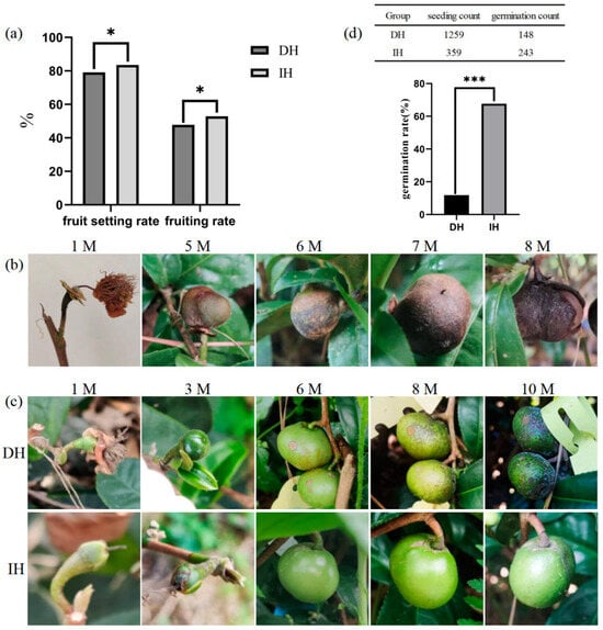 Observational results of fruit development. (a) Fruit setting rate and fruiting rate of two hybrid combinations ten months after pollination. (b) Manifestations of abnormal fruit development after pollination. (c) Differences in the development of normal fruits between the two hybrid combinations after pollination. DH: distant hybridization; IH: intraspecific hybridization. (d) Comparison of the number of seeds sown and the number of germinations in the two hybrid combinations. Note: * Correlation is significant at the 0.05 level; *** correlation is highly significant at the 0.001 level.