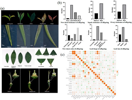 Phenotypic observations of the distant hybrid offspring. (a) Some phenotypic traits of new shoots, mature leaves, and flowers in the distant hybrid offspring. (b) Types and quantities of new shoot trichomes, sepal trichomes, ovary trichomes, new shoot color, mature leaf shape, and leaf size in the distant hybrid offspring. (c) Results of phenotypic trait correlation analysis in hybrid offspring. Note: * Correlation is significant at the 0.05 level; ** correlation is highly significant at the 0.01 level; *** correlation is highly significant at the 0.001 level.