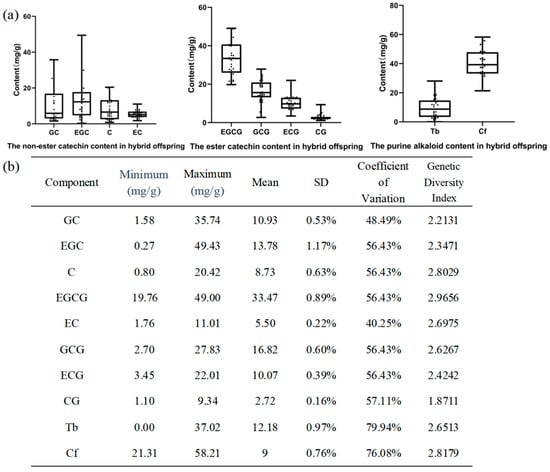 Chemical composition of the distant hybrid offspring. (a) Catechin and purine alkaloid fractions and contents in distant hybrid offspring. (b) Statistical analysis of chemical components in offspring.