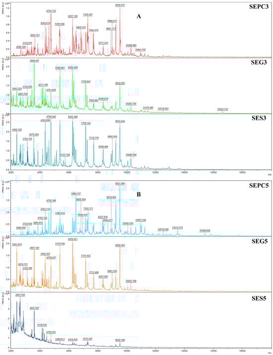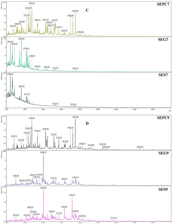 The MALDI-TOF MS spectra illustrating the developmental stages of Salmonella enterica biofilms on glass and stainless steel surfaces under AAEO vapor treatment are shown in Figure 1A–F. Spectra of planktonic cells (used as a control) are also included for comparison. On the third day (SEPC3, SEG3, SES3), the spectra were highly similar between the treated and control samples, with minimal differences in peak composition and intensity. This suggests that protein expression was not yet significantly affected by the treatment at this early stage. By day 5, a divergence became apparent in the stainless steel group (SES5), where changes in peak intensity indicated the onset of antimicrobial effects. On days 7 and 9, the spectra from treated biofilms (especially SEG9 and SES9) showed clear differences from the control (SEPC9), including the appearance of new peaks (e.g., ~6025 Da, ~8300–9500 Da) and altered intensity patterns. These observations confirm that AAEO disrupted the structural and metabolic protein profile of the developing biofilm. On day 14, both SEG14 and SES14 samples exhibited an increase in peak intensity, particularly in the 2000–10,000 Da range, suggesting partial regrowth or microbial adaptation. However, the treated samples remained spectrally distinct from the control, as shown in the dendrogram analysis (Figure 2), which confirms the long-lasting effect of AAEO on biofilm protein expression. Taken together, the results indicate that AAEO vapor had a sustained impact on S. enterica biofilm development, with the most pronounced effects occurring between days 7 and 14 on both surfaces.