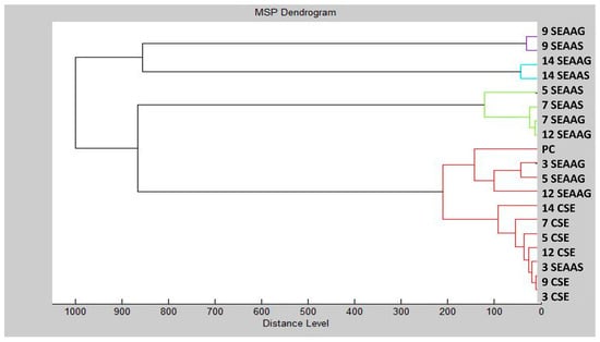 Dendrogram of S. enterica generated using MSPs of the planktonic cells and the control. SE = S. enterica; G = glass; S = stainless steel; and PC = planktonic cells.