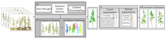 In this study, the Euclidean clustering algorithm was employed to segment individual tomato plants by grouping spatially adjacent points based on Euclidean distance [34]. Considering the vertical growth characteristics of the stalks, a local neighborhood covariance matrix was constructed, and eigenvalue decomposition was performed. Points deviating from the main stem were preliminarily excluded by applying normal vector-based constraints [35]. The stem geometry was further refined using Euclidean clustering combined with cylindrical model fitting to achieve high-precision extraction (Figure 2c). Fruit extraction was based on curvature features. The point cloud normals were first calculated, and the local curvature was estimated using principal component analysis (PCA). A region-growing algorithm was then applied to expand from high-curvature seed points, with the curvature and smoothness thresholds dynamically adjusted to accommodate different fruit sizes [36], as shown in Figure 2d.