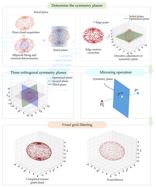 In many studies, the morphological parameters of the fruit were usually calculated using ellipsoid fitting directly applied to the fruit surface. However, this fitting method is highly dependent on the completeness of the point cloud data. When parts of the point cloud were missing, the estimation of the ellipsoid semiaxis parameters became inaccurate, often leading to large deviations between the fitted and actual fruit morphologies. Therefore, direct ellipsoid fitting typically failed to produce accurate results. In this study, based on the symmetry of the fruit, the geometric center of the fruit was first obtained using ellipsoid fitting. PCA was then applied to determine the initial axis of symmetry, followed by ICP-based optimization to generate a three-orthogonal symmetry plane system. The missing regions were subsequently completed using mirror-based processing to reconstruct the tomato fruit, as illustrated in Figure 6.