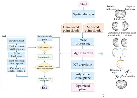 To further optimize the symmetry plane, the adaptive symmetry–dynamic matching algorithm was introduced. The full workflow is illustrated in Figure 4 and includes spatial division, edge contour extraction, iterative alignment, and symmetry plane adjustment. Initially, the fruit point cloud was divided into two spatial regions based on the normal vector of the preliminarily estimated symmetry plane. For point Pi = (xi, yi, zi) in the point cloud, its projection with respect to the plane of symmetry can be expressed as follows: