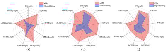 In this study, we compared two fruit completion methods based on ASSM and ellipsoid fitting. The results showed that the ASSM method was better than ellipsoid fitting in R2, RMSE and rRMSE metrics. Especially under high occlusion conditions, the ASSM algorithm dynamically optimizes the symmetry plane to ensure accurate alignment between mirrored and unmirrored contours, thereby improving completion accuracy. To statistically validate these observed differences in completion accuracy, the Wilcoxon signed-rank test was conducted on the paired absolute errors of the two methods for each fruit dimension under the same occlusion level. The statistical significance verified by the Wilcoxon signed-rank test further supported the conclusion that the ASSM method provided a more reliable and stable solution for fruit point cloud completion under complex occlusion scenarios. To visually compare the performance of the two methods across multiple indicators, radar diagrams were generated after applying min–max normalization to all metric values. For normalization, all metrics were standardized on a relative scale, where greater values consistently reflected superior completion results. As shown in Figure 8a, the ASSM fruit completion method yielded higher R2 values, better the ellipsoid fitting method, and the overall error control ability was stronger although the RMSE and rRMSE were smaller. As illustrated in Figure 8b, the ASSM method produced lower RMSE and rRMSE values than the ellipsoid fitting method, indicating reduced prediction error. In Figure 8c, the ASSM method again performed better in terms of the R2, RMSE, and rRMSE, with only minor differences in some individual metrics. Overall, the radar diagrams confirmed that the ASSM method maintained consistently superior or comparable performance.