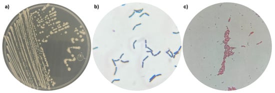 Morphology of strain 53B2: (a) Macroscopic morphology of the colonies; (b) Microscopic morphology of Gram-positive cells; (c) Spores, endospores, and vegetative cells of strain 53B2. Spores and endospores were stained with malachite green stain and appear green/light blue; vegetative cells are stained with safranin and appear pink/red.