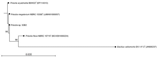 Phylogenetic relationships based on 16S rRNA gene sequences between strain 53B2 and closely related Priestia species: Priestia megaterium NBRC 15308T (JJMH01000057), P. aryabhattai B8W22T (EF114313), and P. flexa NBRC 15715T (BCVD01000224). Bacillus vallismortis DV1-F-3T (JH600237) was used as an outgroup. The phylogenetic tree was constructed using CLC Sequence Viewer version 8.0, employing the Jukes–Cantor distance model and the neighbor-joining method, with 1000 bootstrap replicates. The scale bar (0.035) represents the number of nucleotide substitutions per site.