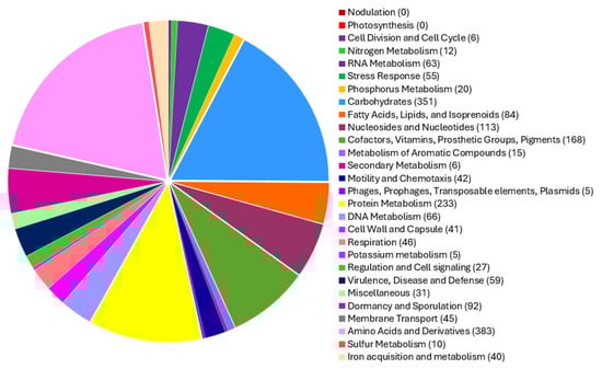 Pie chart with the distribution of subsystem categories among the CDSs of Priestia megaterium 53B2, generated using the RAST server (version 2.0).
