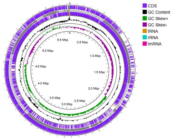Genome annotation for strain 53B2 was carried out using the Rapid Annotation Using Subsystem Technology (RAST) server version 2.0 (https://rast.nmpdr.org/), employing the RASTk pipeline integrated within the PathoSystem Resources Integration Center (PATRIC) platform (accessed on 13 February 2025) [93]. In addition, the Proksee platform (https://proksee.ca/, accessed on 13 February 2025) [94], which utilizes Rapid Prokaryotic Genome Annotation (Prokka) [95], was used to construct a circular chromosome map of strain 53B2, illustrating coding sequences (CDSs), tRNAs, rRNAs, and GC skew.