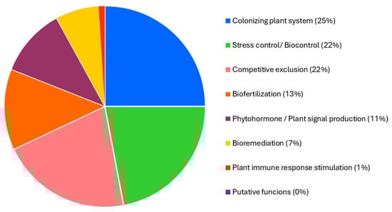 Genome analysis of Priestia megaterium 53B2 revealed that approximately 25% of its genetic content is related to plant colonization processes. Additionally, 22% was associated with stress management and biocontrol functions, 21% with competitive exclusion mechanisms, 13% with biofertilization capabilities, 11% with phytohormone production and plant signaling, 7% with bioremediation potential, and 1% with the stimulation of plant immune responses (Figure 6 and Table S1).