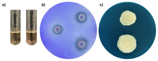 Plant growth-promoting traits were inferred using the PGPT-Pred tool available in PLaBAse (version 1.02) (https://plabase.cs.uni-tuebingen.de/pb/plabase.php, accessed on 24 March 2025) [96]. For this analysis, the protein sequence file obtained from genome annotation using RAST was uploaded to the PGPT-Pred interface to detect genetic elements in strain 53B2. Additionally, to explore biosynthetic gene clusters (BGCs) potentially involved in biocontrol, the genome of strain 53B2 was analyzed through AntiSMASH version 7.0 (https://antismash.secondarymetabolites.org, accessed on 19 February 2025), using the “relaxed” detection settings. This approach allowed the identification of diverse biosynthetic pathways related to secondary metabolite production, including those coding for non-ribosomal peptide synthetases (NRPSs), polyketide synthases (PKSs), types I and II, and ribosomally synthesized and post-translationally modified peptides (RiPP) such as lanthipeptides, lasso peptides, sactipeptides, and thiopeptides [22].