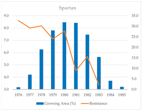 In 1977, Spartan, a descendant of Diamant, was released, which carried a “new” gene, Mla9, as well as Mlk1 [13], providing an overall resistance level of 8.60 in 39 field trials conducted a year before its registration [17]. Three years later, Spartan was historically the most widely grown variety in the Czech Republic, occupying 191,000 ha (31.9% of the crop area). The following year, when its area was 190,000 ha, the resistance was overcome (with an average field score of 4.53), and, in 1983, Spartan became the most susceptible (3.38) among all tested varieties. Since Spartan was the only commercial variety possessing Mla9, and because other resistant varieties were already available (see next paragraph), its growing area decreased quickly to 1.2% in 1985 (Figure 2). The widespread cultivation of Spartan and the progression of its susceptibility demonstrate a typical “boom-and-bust” cycle of varieties with specific resistance genes against diseases caused by pathogens that rapidly adapt [3].