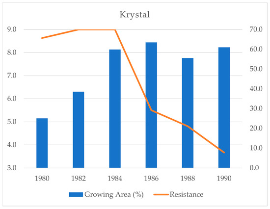 The resistance of Krystal, a spring barley variety carrying the resistance genes Mla13 and Mlg against powdery mildew, in the field (9 = full resistance) and the area under cultivation as a percentage of varieties possessing Mla13 grown in the Czech Republic from 1980 to 1990 [9,17].