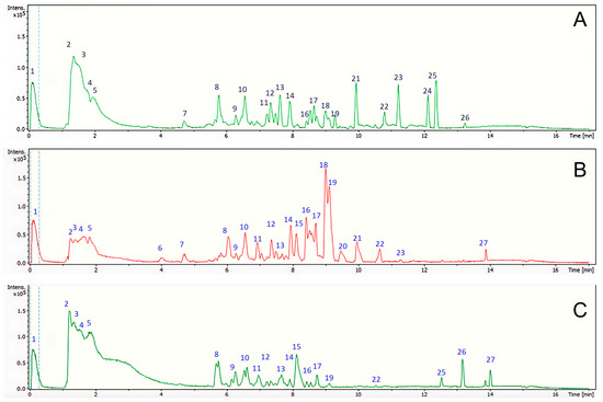 UHPLC/ESI/MS/MS chromatograms: (A) Nicotiana tabacum aqueous extract (DW-E), (B) N. tabacum CU extract (CU-E), (C) N. tabacum FGS extract (FGS-E).