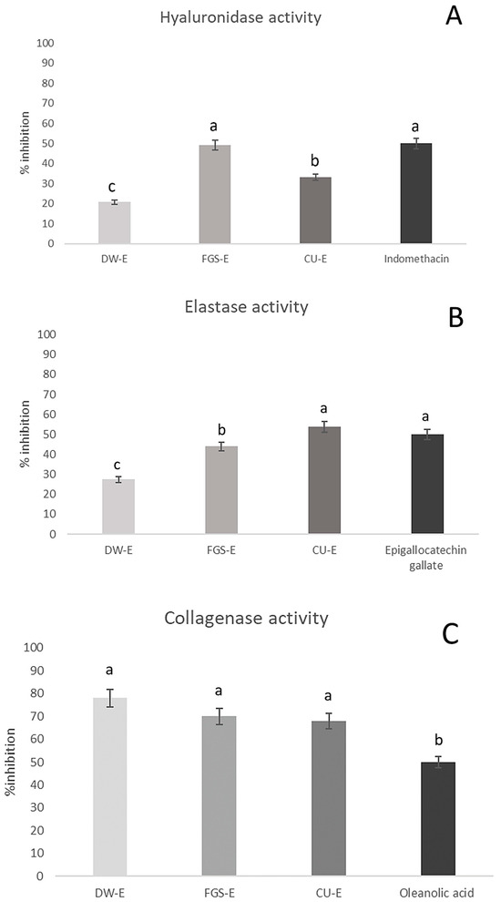 Effect of apical leaf waste of Nicotiana tabacum green extracts on hyaluronidase, elastase, and collagenase activity. DW-E: aqueous extract; FGS-E: extract in FGS solvent, and CU-E: extract in CU solvent; FGS: fructose:glucose:sucrose; CU: choline chloride:urea. (A) anti-hyaluronidase activity, (B) anti-elastase activity, and (C) anti-collagenase activity. In all cases, the maximum % inhibition of enzyme activity for each extract is included. The reference compounds are included in the graphs. Values are expressed as means ± standard deviation from triplicate measurements. Different letters indicate statistically significant differences among all samples, according to Tukey’s multiple comparison tests (p < 0.05).