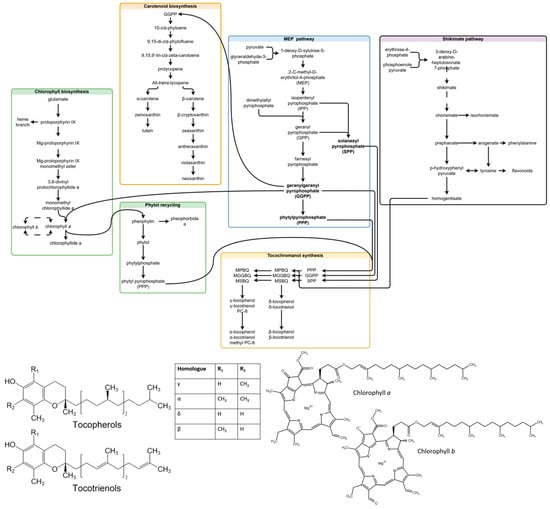 Related steps in chlorophyll, carotenoid and tocochromanol biosynthesis, and molecular structures of the analyzed compounds. Some unrelated steps are shown, and the simplified transformation of contents (missing steps) is represented by dashed lines. The scheme is a combination of biosynthesis pathways published in existing articles [7,25,26,27,28,29]. Abbreviations not deciphered in chart: MPBQ, 2-methyl-6-phytyl-1,4-benzoquinol; MGGBQ, 2-methyl-6-geranylgeranyl-1,4-benzoquino; MSBQ, 2-methyl-6-solanesyl-1,4-benzoquinol; DMPBQ, 2,3-dimethyl-6-phytyl-1,4-benzoquinol; DMGGBQ, 2,3-dimethyl-6-geranylgeranyl-1,4-benzoquinol; DMSBQ, 2,3-dimethyl-6-solanesyl-1,4-benzoquinol.