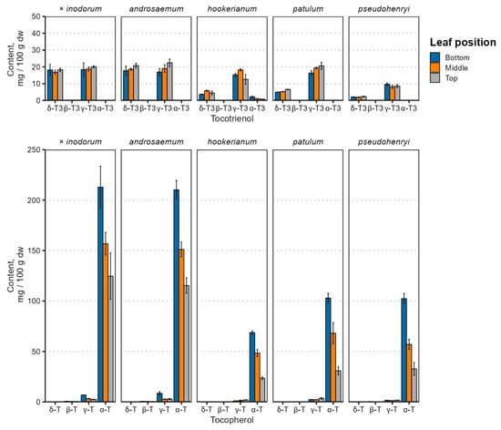 Tocochromanol content variation in Hypericum species’ leaves depending on leaf position. Data are presented as means ± standard deviations (n = 3).