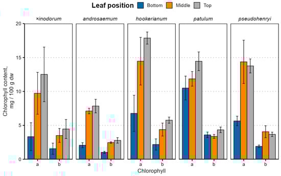 Chlorophyll content variation in Hypericum species’ leaves depending on the leaf position. Data are presented as means ± standard deviations (n = 3).