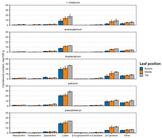 This is likely explained by the simultaneous upregulation of genes and enzymes involved in carotenoid biosynthesis [48]. The carotenoid content was higher in younger leaves. The main identified carotenoids in the leaves were lutein and β-carotene, in this order, regardless of their position. In total, up to seven carotenoids were identified. Apart from lutein and β-carotene, neoxanthin, violaxanthin, zeaxanthin (usually co-eluting with lutein), β-cryptoxanthin and α-carotene were present (Figure 4). The total carotenoid content ranged from 15.33 mg 100 g−1 in early (bottom) H. androsaemum leaves to 61.13 mg 100 g−1 in top (young) H. patulum leaves. The total carotenoid content was higher in Ascyreia species leaves than in Androsaemum section species leaves.