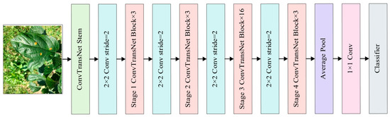 The construction of the leaf disease identification model is depicted in Figure 2. The ConvTransNet-S model employs a stage-wise architecture design akin to CNNs, generating multi-scale feature maps through four hierarchical stages. At each feature extraction stage, the network utilizes a patch embedding layer, consisting of four convolutional layers interspersed with normalization layers, thereby achieving simultaneous feature abstraction and spatial downsampling. This hierarchical architecture enables a progressive downsampling mechanism for feature map resolution while systematically expanding channel dimensions to enhance the capacity for semantic representation. Within each stage, multiple ConvTransNet blocks are sequentially stacked to perform feature transformation while maintaining the input resolution. The network architecture varies the number of stacked ConvTransNet modules across stages: Stages 1, 2, and 4 each integrate three modules for efficient feature encoding, whereas Stage 3 incorporates 16 modules to enhance the hierarchical feature extraction capacity through dense contextual modeling. The model concludes with a global average pooling layer, a projection layer, and a 1000-way classification layer utilizing softmax [32].