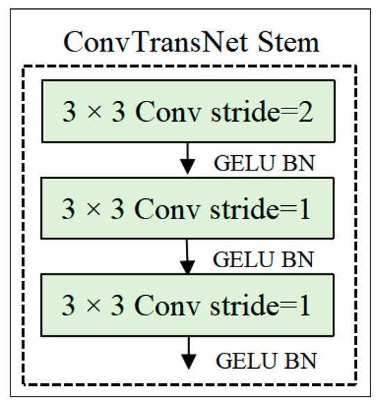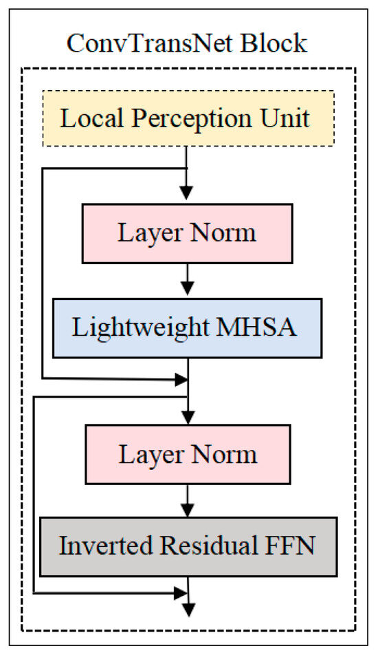 The input image underwent fine-grained feature extraction via the Stem module, consisting of three stacked 3 × 3 convolutional layers. Notably, the initial convolutional layer employs a stride of 2 to produce 32 output channels, achieving spatial reduction while preserving essential local patterns. Two subsequent convolutional layers with stride 1 further enhance local feature representations. The resulting features are processed by multiple stacked ConvTransNet blocks for deep hierarchical learning. The ConvTransNet block architecture is systematically illustrated in Figure 3.