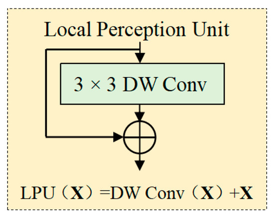where denotes the input tensor, represents the spatial resolution (height width) of the feature map at the current processing stage, and indicates the channel dimension. corresponds to a depthwise convolution. The detailed architecture of the LPU is illustrated in Figure 5.
