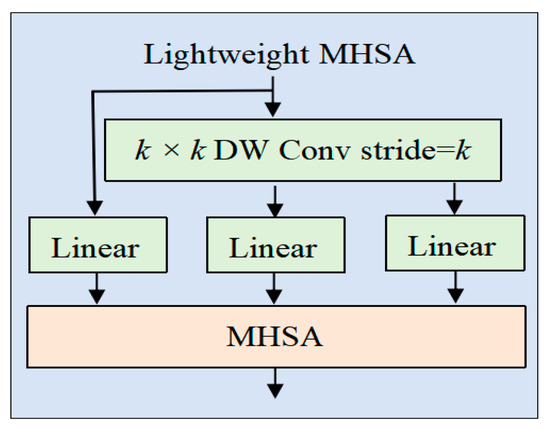 To reduce the computational cost of the self-attention module, the LMHSA module is defined with heads. A depthwise separable convolution with a stride of is utilized to decrease the spatial dimensions of and before the attention operation. Additionally, a relative position bias, , is incorporated into each self-attention module. The corresponding lightweight attention is defined as follows: