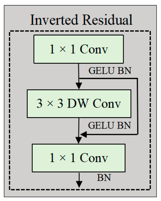 The structure of the IRFFN, including 1 × 1 convolution, GELU activation function, 3 × 3 depthwise separable convolution, and Batch Normalization (BN).