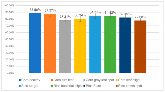 To gain deeper insight into the recognition capabilities of ConvTransNet-S for various plant diseases, we conducted a fine-grained performance evaluation utilizing subclass datasets, with particular emphasis on morphologically similar disease phenotypes across different infection stages. The test dataset comprised eight disease categories, four maize diseases (including healthy leaves) and four rice diseases, thereby forming a comprehensive evaluation framework. As illustrated in the classification accuracy results in Figure 8, the model achieved a peak accuracy rate of 88.50% in detecting healthy maize leaves, significantly outperforming its performance on diseased samples. This finding validates the model’s strong discriminative capacity in establishing decision boundaries for healthy versus diseased binary classification. The model exhibits robust recognition efficacy for disease categories with distinct morphological characteristics: corn rust achieved an accuracy of 87.57%, attributed to sensitive capture of chlorotic disease features; rice tungro attained 84.71%, benefiting from strong feature responses to chlorotic streaking patterns; and rice bacterial blight reached 84.32%, closely linked to precise localization of translucent stripe symptoms.