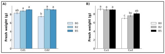 Fresh weight (mean ± SE, n = 10) of lettuce plants grown in soil contaminated with Cd (A) and Cu (B). Cd1 = Cd 5 mg kg−1; Cd2 = Cd 15 mg kg−1; Cu1 = Cu 200 mg kg−1; Cu2 = Cu 600 mg kg−1. B0 = biochar 0%; B2 = biochar 2%; B5 = biochar 5%. Different letters indicate statistically significant differences between the treatments (p < 0.05).