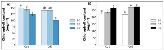 Regarding the chlorophyll content, B-grown plants exposed to Cd1 and Cd2 exhibited a statistically significant reduction at the B5 concentration (−15.4% and −29.6%, respectively) (Figure 2A). In contrast, an increase was detected in Cu1 under B5 (+14.9%) and in Cu2 for both B2 and B5 (+21.1% and 24.1%, respectively) (Figure 2B).