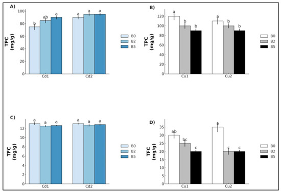 Total phenolic content (TPC) and total flavonoid content (TFC) (mean ± SE, n = 10) of lettuce plants grown in soil contaminated with Cd (A,C) and Cu (B,D). Cd1 = Cd 5 mg kg−1; Cd2 = Cd 15 mg kg−1; Cu1 = Cu 200 mg kg−1; Cu2 = Cu 600 mg kg−1. B0 = biochar 0%; B2 = biochar 2%; B5 = biochar 5%. Different letters indicate statistically significant differences between the treatments (p < 0.05).