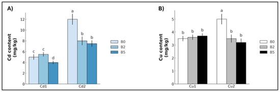 Cadmium (Cd) and copper (Cu) content (mean ± SE, n = 10) of lettuce plants grown in soil contaminated with Cd (A) and Cu (B), respectively. Cd1 = Cd 5 mg kg−1; Cd2 = Cd 15 mg kg−1; Cu1 = Cu 200 mg kg−1; Cu2 = Cu 600 mg kg−1. B0 = biochar 0%; B2 = biochar 2%; B5 = biochar 5%. Different letters indicate statistically significant differences between the treatments (p < 0.05).