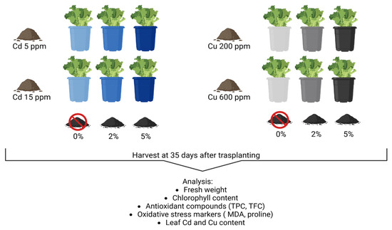 This study was guided by the hypothesis that a biochar addition to Cd- (5 mg kg−1 and 15 mg kg−1) and Cu-contaminated (200 mg kg−1 and 600 mg kg−1) soils can immobilize metals, thereby reducing their uptake by plants, alleviating oxidative stress, and improving lettuce growth and yield. To test this, the specific objectives are as follows: (i) to evaluate biochar’s effect on soil metal bioavailability; (ii) to quantify Cd and Cu accumulation in lettuce tissues; (iii) to assess oxidative stress responses; and (iv) to determine changes in biomass and yield under biochar amendment.